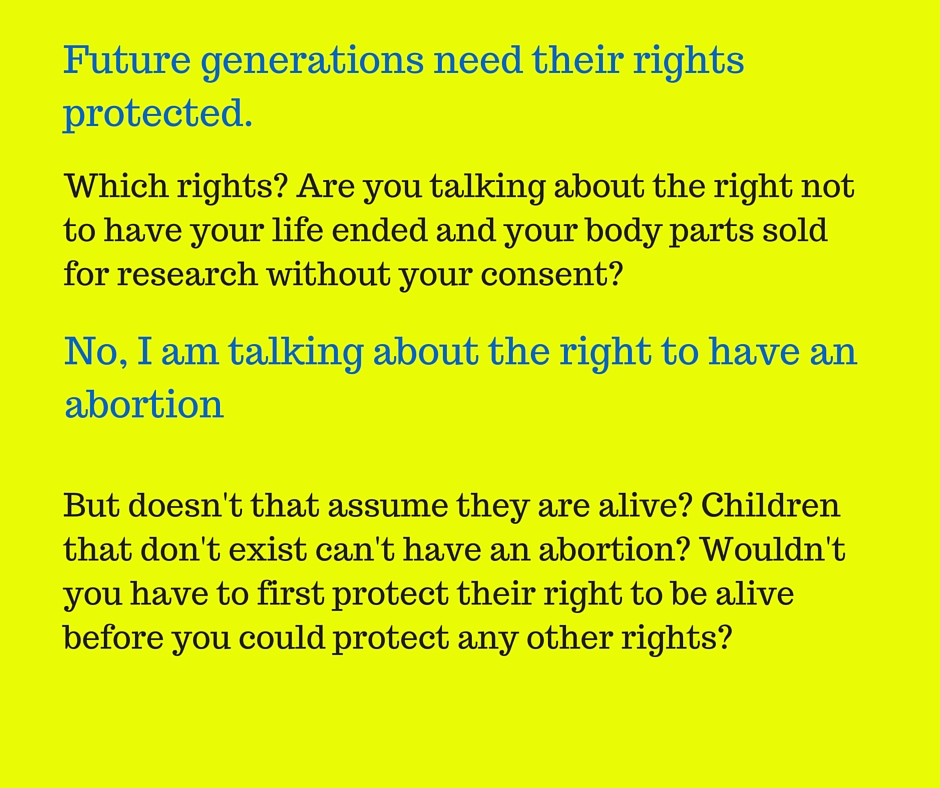 This is part of the insanity of abortion, that someone would try to make an argument for abortion by talking about the rights of children yet to be born.  Future generations must have the right to abort their children, even if they don’t have the right to exist. In this mindset, the right not to be pregnant trumps the right not to be killed.